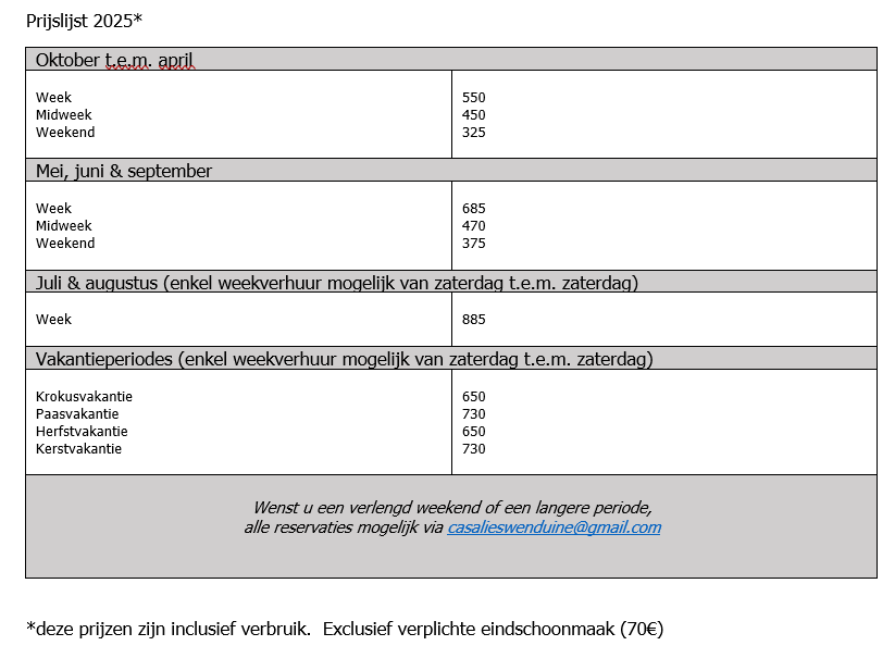 • Onze huurprijs is inclusief het verbruik (water + elektriciteit): indien er sprake is van een buitensporig verbruik zal dit na uw verblijf berekend worden en afgetrokken van de huurwaarborg.